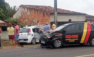 A colisão desta manhã envolveu um carro modelo Fiat / Palio e outro Chevrolet / Onix. Este último, plotado com informações de uma empresa de segurança e transportes de valores.