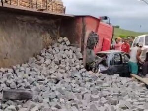 Um caminhão caçamba que carregava paralelepípedos tombou na tarde desta quinta-feira, 25, e parte da carga atingiu pedestres e veículos no município de Riachão do Dantas. Algumas pessoas ficaram feridas, mas foram socorridas por populares.