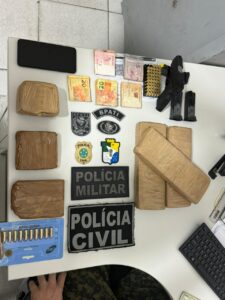 Ainda na abordagem, a mulher indicou que o homem que entregou a droga estaria na frente da casa dela para receber o valor da venda das substâncias. Os policias, então, se deslocaram até o local e encontraram o suspeito dentro de um carro. Neste momento, os agentes o questionaram sobre o vínculo que ele tinha com a suspeita, mas ele negou. Por outro lado, ele indicou que tinha uma arma de fogo em casa, e os policiais se dirigiram até a residência. No local, além da arma, os agentes encontraram uma quantia em dinheiro e dois cheques.