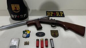 Durante a abordagem, além de espingarda calibre. 12 com um cartucho, os policiais encontraram duas munições intactas e uma deflagrada do mesmo calibre, três munições calibre. 380, cocaína e uma balança de precisão.