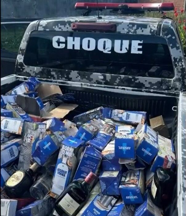 Imagens divulgadas pela PM mostram garrafas de vodka e whisky. Todo material apreendido foi levado para a Central de Flagrantes.