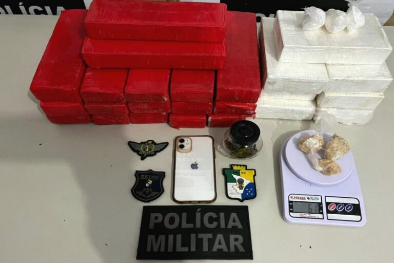 Os militares se deslocaram até o endereço indicado e, durante as buscas, apreenderam mais de 19 kg de maconha fracionados em vários tabletes, três embalagens plásticas contendo 79 g de cocaína e quatro embalagens plásticas com 64 g de crack.
