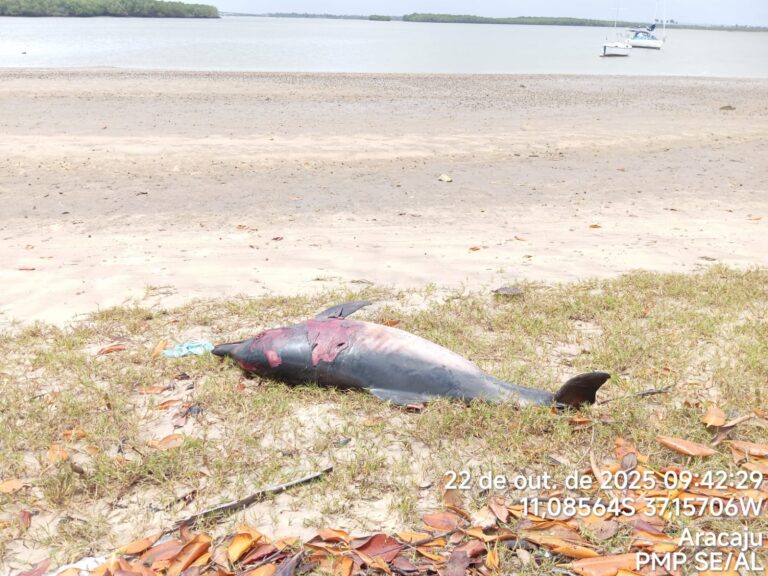 A Fundação Mamíferos Aquáticos (FMA) realizou, na manhã desta quarta-feira, 22, o resgate de um golfinho encontrado morto às margens do Rio Vaza Barris, em Sergipe. O acionamento ocorreu após a divulgação de vídeos nas redes sociais mostrando moradores interagindo com o animal, o que motivou uma ação emergencial de educação ambiental e sensibilização comunitária.