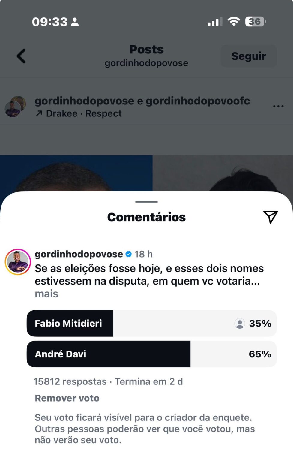 Uma enquete criada neste sábado no Instagram, na página do Gordinho do Povo, gerou muita repercussão. Segundo Gordinho, foram mais de 4 milhões de pessoas alçadas pela postagem e mais de 15 mil votos na enquete. A pergunta era em quem os seguidores votariam, André David ou Fábio Mitidieri. Até o fechamento da coluna, André obteve 65% contra 35% de Fábio. Lembrando que enquete não tem medida científica. Mas que essa fez muito barulho, isso fez.