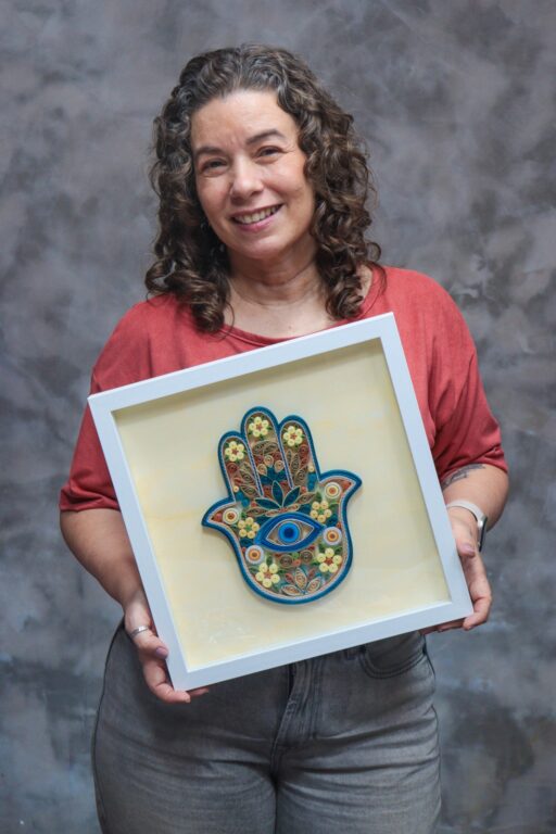 “Eu descobri o Quilling ainda na universidade e me encantei com a possibilidade de transformar algo tão simples quanto o papel em obras que expressam emoção, fé e sensibilidade. O que me atraiu foi a delicadeza do processo e o resultado visual, uma arte que exige paciência, concentração e um olhar afetuoso para o detalhe”, explica a artista.